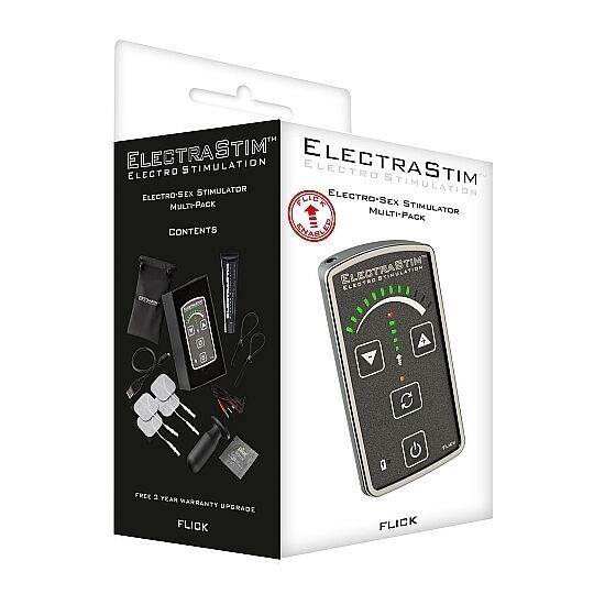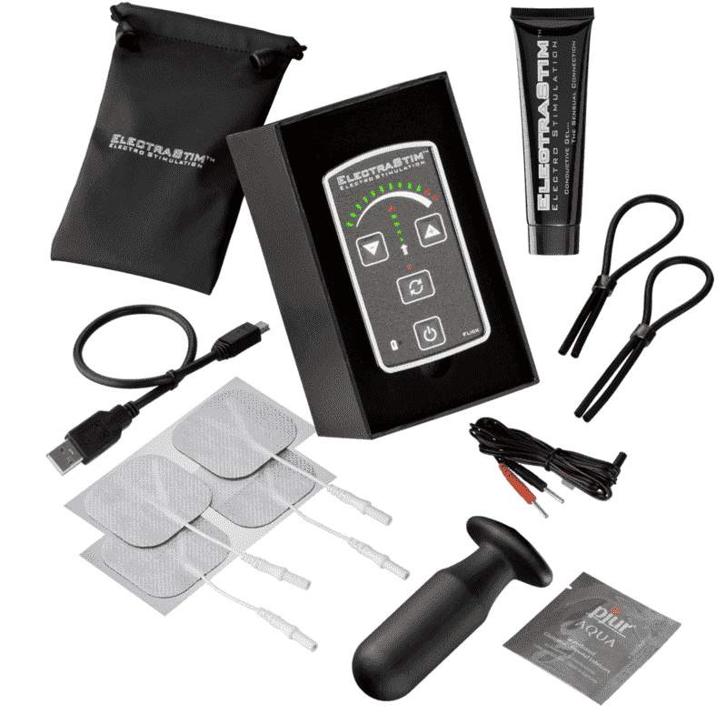 The ElectraStim Flick EM60-M package includes a stimulator, all necessary cables, a set of 4 ElectraPads, 2 ElectraLoops adjustable penis rings, and a Silicone Noir Aura electrode (suitable for vaginal and anal use).