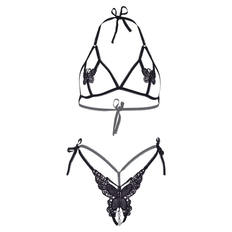 Product summary: LEG AVENUE TWO PIECES SET BRA AND PANTY OF BUTTERFLIES & PEARLS ONE SIZE – BLACK