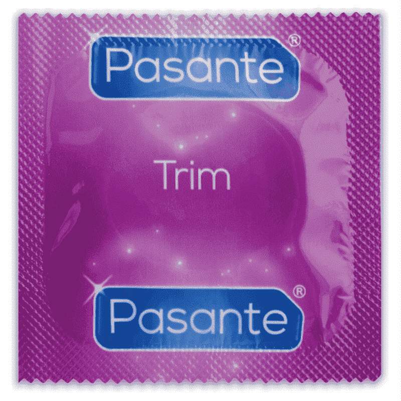 Pasante Trim condoms offer a narrower width for a smaller fit. Parallel, smooth, natural color.